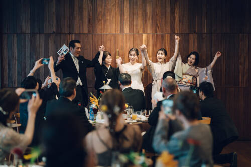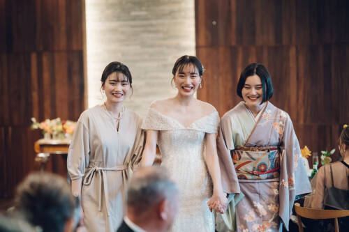 披露宴でのお色直し退場の際には、お姉様お二人とご一緒に歩いていただき、その後サプライズでご両親にもご登場いただきました。
