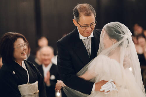 記念品贈呈で、両家ご家族がそれぞれハグを交わし、新婦様のお父様が思わず新婦様の手を取り、皆様に向けて拳を高く掲げる姿からは、新婦様を想う深いお気持ちが伝わってきました。