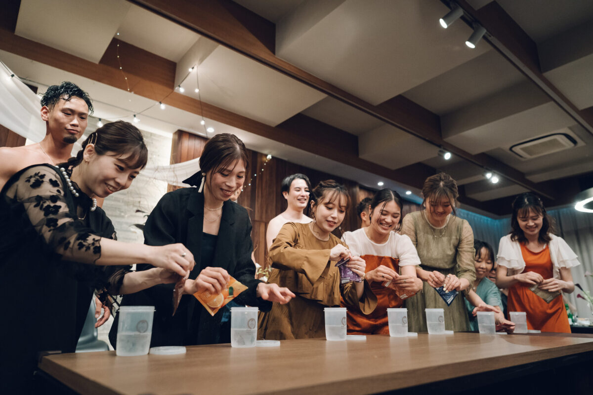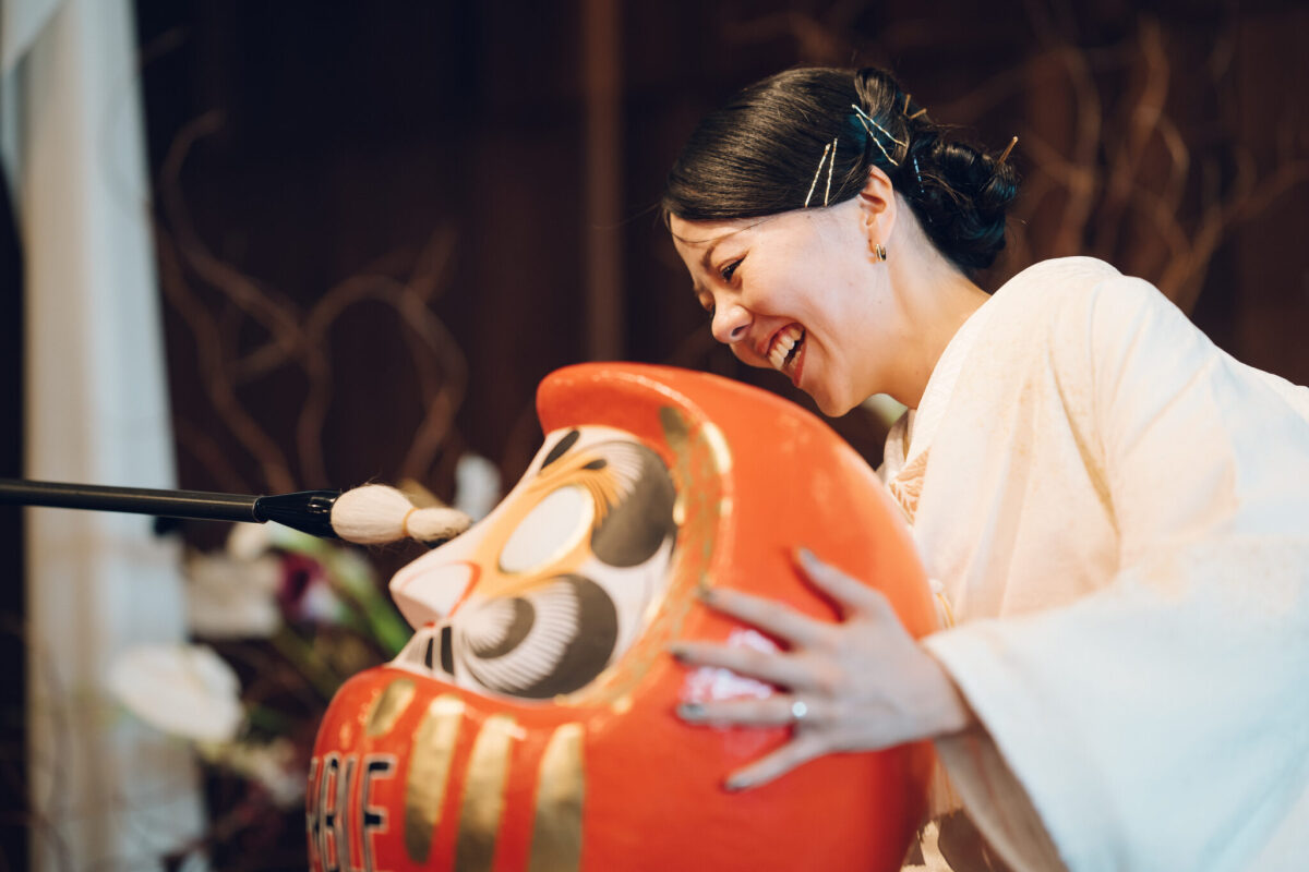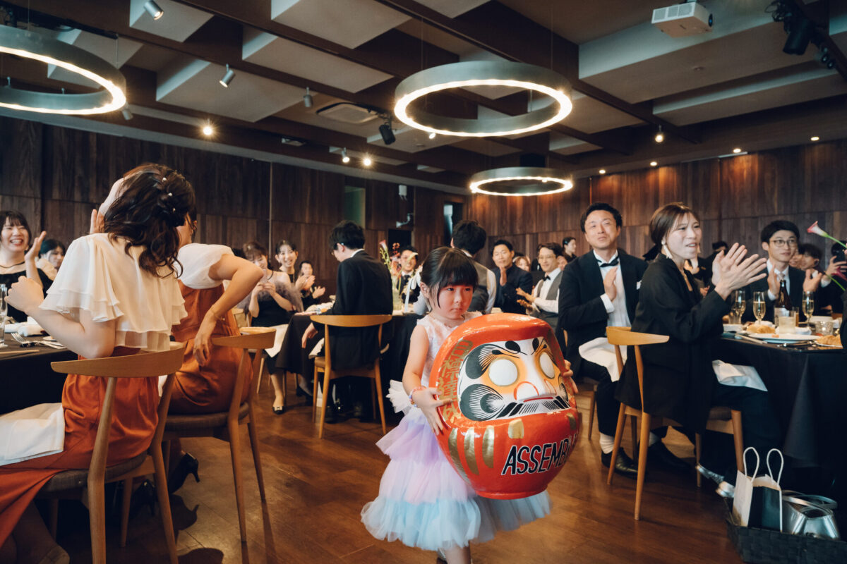 乾杯の後は、新郎様が開業予定のパーソナルジムの商売繁盛を願うだるまの目入れセレモニー、ボディービルダープロテイン早飲み対決、愛あふれるご友人からのお手紙など、笑いと涙に包まれる時間となりました。