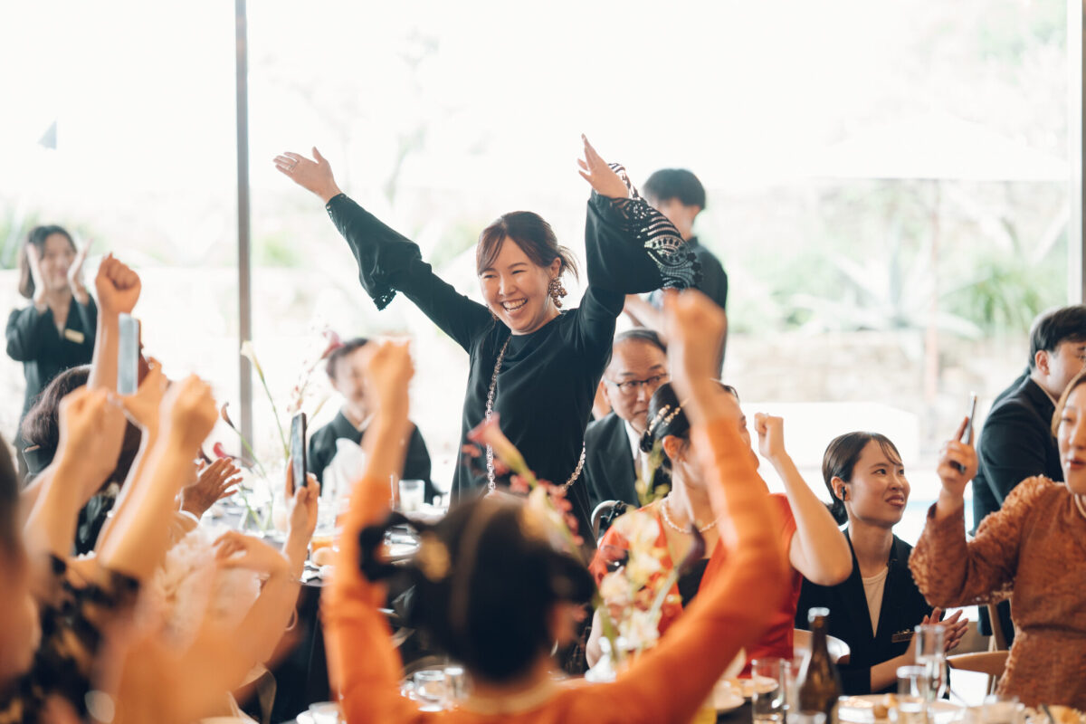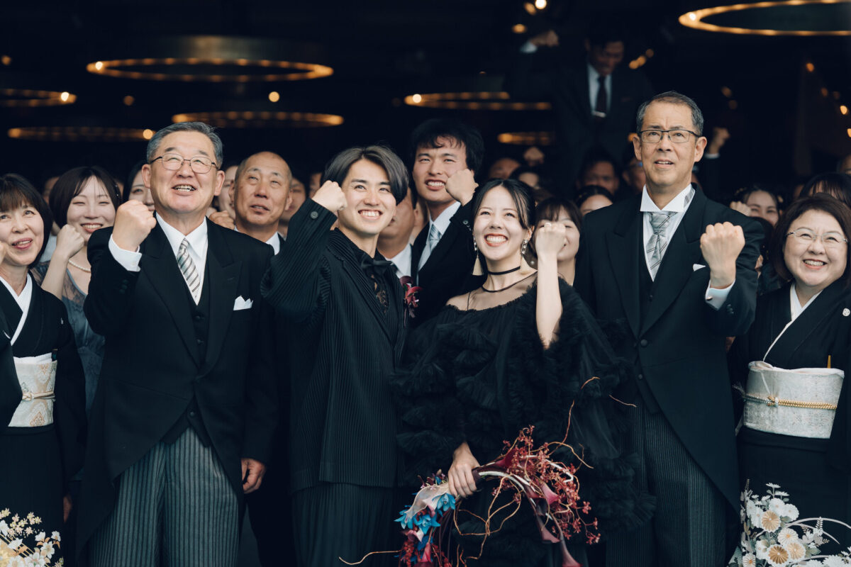 記念品贈呈で、両家ご家族がそれぞれハグを交わし、新婦様のお父様が思わず新婦様の手を取り、皆様に向けて拳を高く掲げる姿からは、新婦様を想う深いお気持ちが伝わってきました。