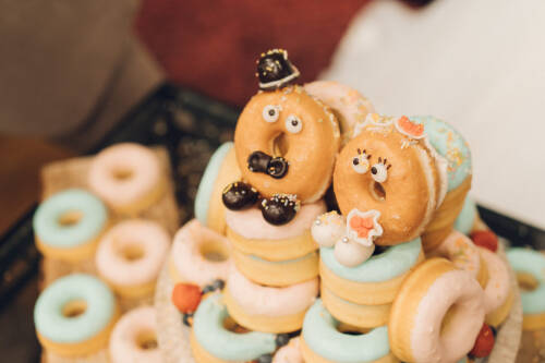 新郎新婦様に見立てたドーナツに幸せのカラースプレーをおふたりでシャワー