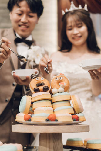新郎新婦様に見立てたドーナツに幸せのカラースプレーをおふたりでシャワー
